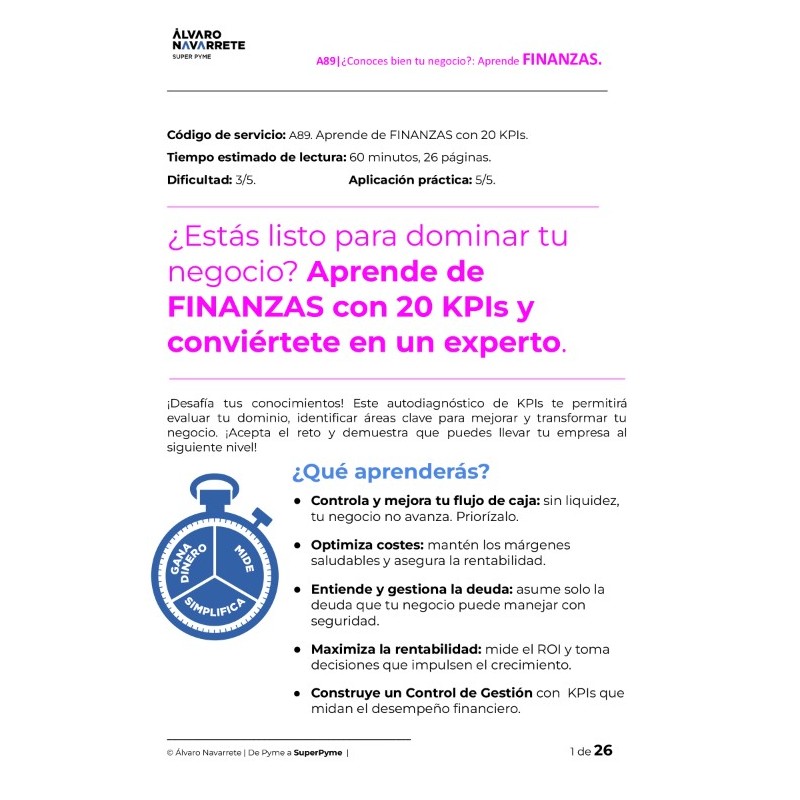 Cada autodiagnóstico incluye 20 métricas clave diseñadas para que domines esa área específica del negocio. ¿Por qué 20? Porque es un número equilibrado: ni demasiados, ni pocos, lo suficiente para tener una visión completa sin perder el enfoque. Sin embargo, lo ideal es que te concentres en 3 a 5 métricas que realmente importen. Con el tiempo y la experiencia, serás tú quien defina y ajuste tus propios KPIs. Ese es el objetivo.