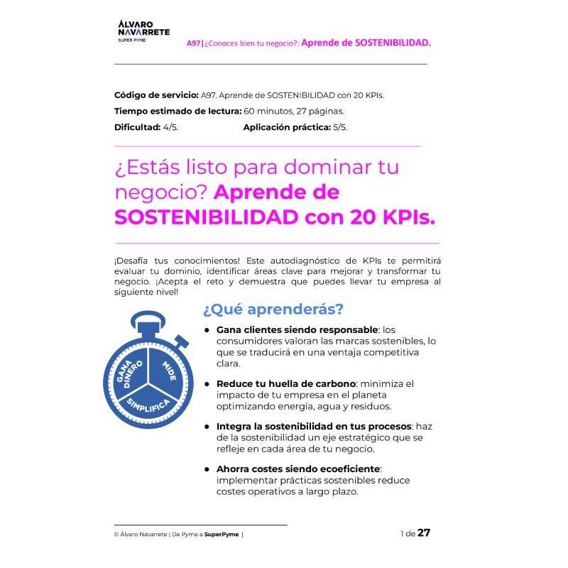 Cada autodiagnóstico incluye 20 métricas clave diseñadas para que domines esa área específica del negocio. ¿Por qué 20? Porque es un número equilibrado: ni demasiados, ni pocos, lo suficiente para tener una visión completa sin perder el enfoque. Sin embargo, lo ideal es que te concentres en 3 a 5 métricas que realmente importen. Con el tiempo y la experiencia, serás tú quien defina y ajuste tus propios KPIs. Ese es el objetivo.