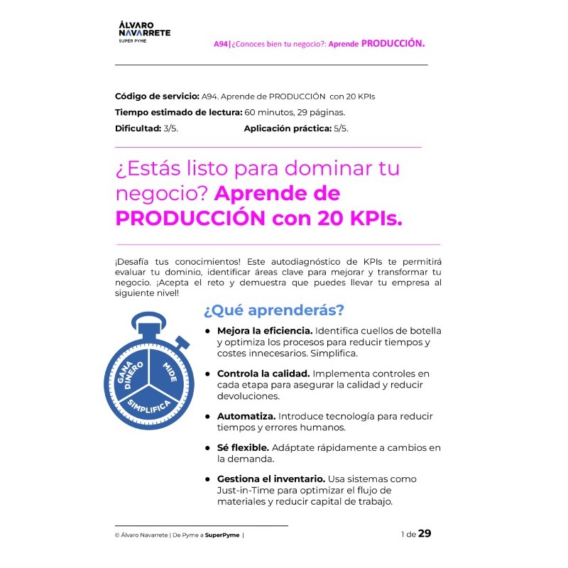Siempre que intento mejorar algo, me hago estas tres preguntas: ¿De dónde venimos? ¿Dónde estamos? ¿Hacia dónde vamos? Algo que quiero resaltar es que para dominar una métrica o KPI, necesitas saber cómo mejorarla. Por eso, en cada autodiagnóstico te pido que registres el dato de cierre del último trimestre y fijes un objetivo claro para el siguiente. 90 días son un plazo suficiente para tener una idea clara de cómo va un área y cómo mejorarla. Ese es el reto siguiente. Mejorar. Tener claridad en los datos te permitirá proyectar mejoras y acelerar tus resultados a futuro. ¿Me sigues?