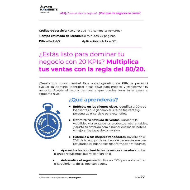 Cada autodiagnóstico incluye 20 métricas clave diseñadas para que domines esa área específica del negocio. ¿Por qué 20? Porque es un número equilibrado: ni demasiados, ni pocos, lo suficiente para tener una visión completa sin perder el enfoque. Sin embargo, lo ideal es que te concentres en 3 a 5 métricas que realmente importen. Con el tiempo y la experiencia, serás tú quien defina y ajuste tus propios KPIs. Ese es el objetivo.