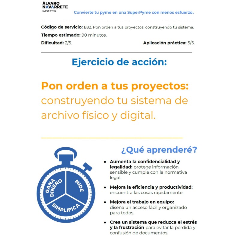 El objetivo de este ejercicio es diseñar y cumplir con la normativa interna de archivo físico y digital. Aprenderemos a construir y mantener un sistema de archivo eficiente que mejore la confidencialidad y legalidad, la eficiencia y la colaboración en equipo. Además, reducirá el estrés y la frustración al facilitar el acceso a los documentos necesarios y asegurar la destrucción adecuada de los que ya no son útiles.