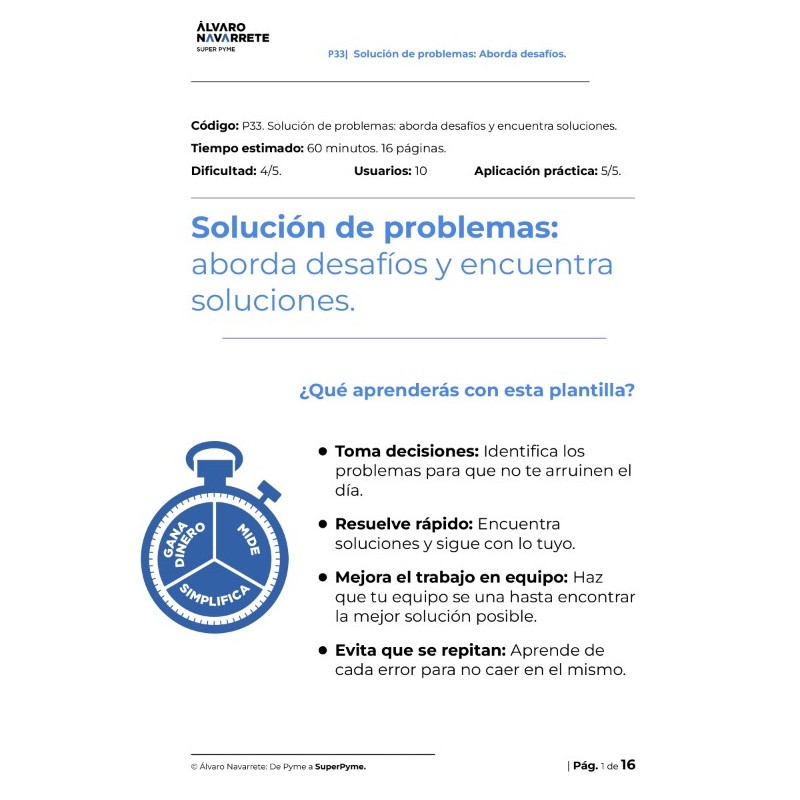 Con esta plantilla, vas a tener todo lo que necesitas en una sola página para abordar los problemas más complicados, como si estuvieras siguiendo un mapa del tesoro. ¿La clave? Tener claros los datos, identificar qué está fallando, y sobre todo, encontrar soluciones que no solo sean rápidas, sino también creativas. ¡Nada de quedarse en la zona de confort! Eso sí, no te lo tomes con demasiada calma: cuanto antes actúes, antes podrás volver a disfrutar de tu café. Te ayudará a abordar problemas de manera estructurada, identificar sus causas raíz y proponer soluciones efectivas. A tener a tod el mundo en la misma página. La gracia está en tener todos los datos relevantes y convertirlos en información útil en una sola página, como si tuvieras un mapa del tesoro que te guía directamente hacia la solución. Esta herramienta te permite simplificar el proceso de resolución de problemas, asegurando que se consideren todos los aspectos involucrados y se llegue a una solución práctica y medible.