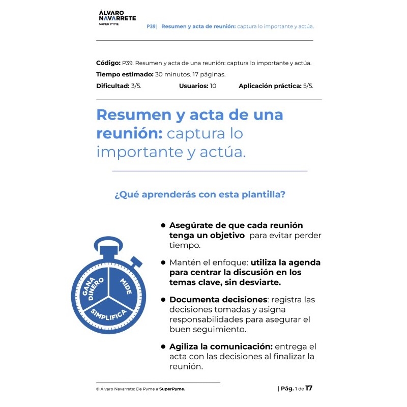 El objetivo de la plantilla "Una buena acta de reunión" es asegurar que todas las decisiones, acuerdos y responsabilidades queden claros, documentados y disponibles para todos los participantes, permitiendo un seguimiento efectivo y evitando malentendidos. Esta herramienta agiliza la comunicación y facilita la ejecución de tareas al garantizar que todos sepan qué hacer y cuándo hacerlo, creando un sistema de comunicación ágil y eficiente que asegure la acción y el cumplimiento de los compromisos.